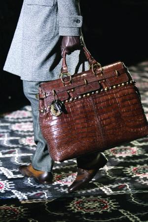 褐色的鱷魚皮大包與灰大衣配十分有型