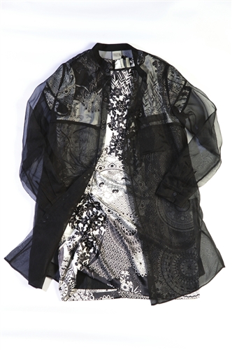 抽象的中國剪紙黑白印花,搭配輕透的歐根紗衣,若隱若現(xiàn),別致高雅。