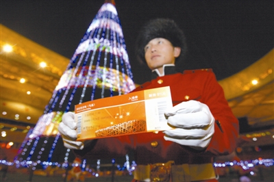 國家體育場“鳥巢”昨起正式啟用新票樣。此外,從昨天起到明年1月10日,“鳥巢”每天的閉場時(shí)間將延后一小時(shí),由原來的18時(shí)延長至19時(shí)。(金可/攝)