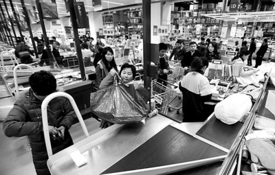 昨天下午2:30左右,記者在宜家商場內(nèi)看到,不少消費(fèi)者不顧昨天是上班日,紛紛翹班前往血拼。商場內(nèi)幾乎各個區(qū)域都擠滿了人。在收銀處,30個收銀臺前全部排起了長龍,幾乎每條隊(duì)伍都有近50米長。在一條通道口,一名保安指著身旁的一堆購物袋告訴記者,這些都是不愿排長隊(duì)買單的顧客留下的,因?yàn)闁|西買得不多,又不情愿排長隊(duì)付錢,所以寧愿不買了。