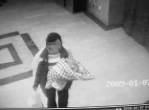 女子進了大門后,左右張望了一下,神情緊張,隨后匆匆朝大廳走去。一分鐘后,女子聽到樓上的喧嘩聲,立即退到剛才的門口,站在兩臺查詢機旁邊,一邊等待,一邊不時低頭看一看手中的孩子,輕輕哄一哄。又過了一分多鐘,女子快步抱著孩子從攝像頭下方走過,朝電梯間方向去了。