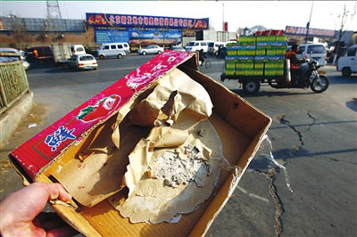昨天下午,記者見到了這種紙箱。在箱子底部,貼有一張黃色草紙,摸起來凹凸不平。拿刀子割開草紙發(fā)現(xiàn),紙箱底部沾著一層“膩?zhàn)语灐,直徑約一尺,厚約3毫米,尚未完全干透。記者從市場內(nèi)找了一臺(tái)電子秤測量,這個(gè)特殊的箱子質(zhì)量有2斤1兩,而與之相同的一般紙箱不到一斤。