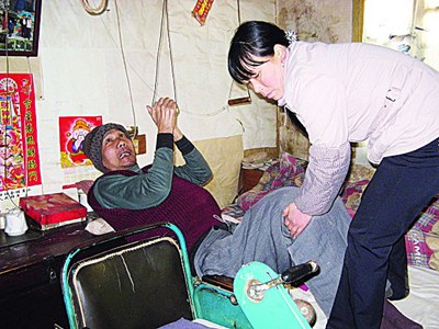 索海存老人說:“自從菊會嫁入我家,吃喝拉撒全靠她。每隔幾十分鐘我就會不由自主地抽風,菊會就不停地給我拉腿、壓胳膊。躺在床上時間一長不舒服,菊會還要不時地扶我坐一會……”