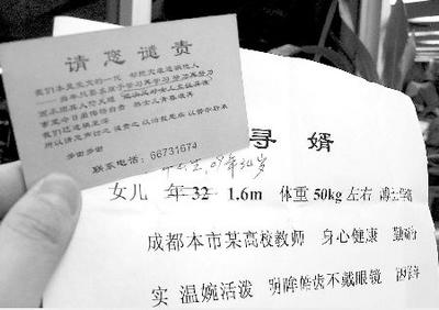 這是一份不同尋常的征婚啟事。它印在名片上。言語中,滿是自責(zé)。文字來自于父母:當年只要求孩子學(xué)習(xí)再學(xué)習(xí),努力再努力,而不顧人倫天理,堅決反對女兒交往異性,時至今日雖悔悟自責(zé),然女兒青春難再……