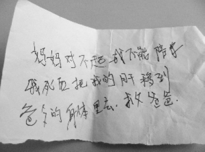 令崔女士怎么也沒(méi)有想到的是,1月24日中午12點(diǎn)半左右,當(dāng)她從醫(yī)院回到家,卻發(fā)現(xiàn)自家大門(mén)被反鎖了,“我只好從后院翻墻進(jìn)去,看到女兒躺在床上一動(dòng)不動(dòng),就像死了,旁邊有兩個(gè)安眠藥空瓶和一張遺書(shū),上面寫(xiě)著‘?huà)寢寣?duì)不起,我不能陪你,我死后把我的肝移到爸爸的身體里去,救爸爸!贝夼款D時(shí)覺(jué)得天旋地轉(zhuǎn),“這兩瓶安眠藥有200粒!女兒是23日傍晚五點(diǎn)多在醫(yī)院吃過(guò)晚飯回家的,到我發(fā)現(xiàn)的時(shí)候,有十多個(gè)小時(shí)了。”