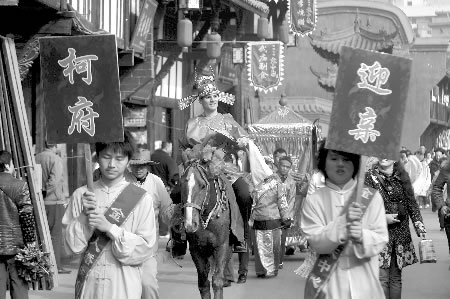 上午9時許,在震天的鑼鼓聲中,33歲的新郎Nicholas(中文名柯家樺)騎著一匹高頭大馬,帶著迎親隊伍由資中鼓樓壩廣場出發(fā),浩浩蕩蕩地前往當(dāng)?shù)赜忻奈幕袍E文廟。馬背上的新郎羽扇綸巾,而新娘則端坐在花轎中,前有“媒婆”和“丫鬟”帶路?h城少有如此特殊的迎親隊伍,加之新郎是一個膚色白皙的老外,沿途引得不少群眾駐足。
