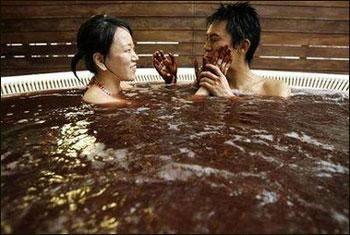 一對(duì)日本情侶在享受巧克力溫泉浴。