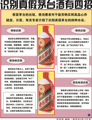 據(jù)她介紹,茅臺酒廠目前在北京專設(shè)了多名打假人員,通過明察暗訪的方式,尋訪假酒的線索。一旦發(fā)現(xiàn)假酒,將舉報工商部門或以法院起訴的方式“打假”。她說,目前打假人員還是主要針對高檔餐廳、酒店和超市進(jìn)行打假。對一些小的煙酒店所賣的假茅臺酒,他們暫不作為“打假”重點。莫律師承認(rèn),目前在市場上存在著大量假茅臺酒,但針對“出了貴州,就喝不到真的茅臺”和“茅臺酒中80%是假酒”的傳言,她表示假酒并無傳言中的那樣多。
