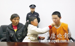 因?yàn)榕c人結(jié)伙搶劫,昨日上午10時(shí)50分,15歲少年王言在渝中區(qū)法院少年法庭受審。王言11歲的妹妹從100多公里外的老家趕到法院,給哥哥送來(lái)兩顆糖。