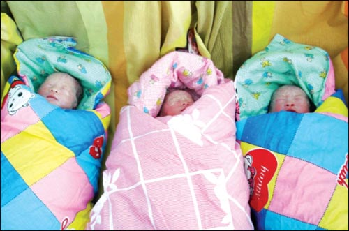 由于家里經(jīng)濟困難,這次直到懷孕5個月時,童芳才在丈夫的陪同下到醫(yī)院做B超檢查,發(fā)現(xiàn)懷的竟是三胞胎!爱敃r我又開心又擔心,開心的是竟然一次懷了三個,擔心的是怕三個全是女兒!蓖继寡。