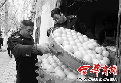 那位店主還告訴他饅頭變白有好幾種辦法,一種是給面粉里添加增白劑,有漂白粉、吊白塊等,一袋面粉中就加二三兩。最省錢(qián)的辦法就是在饅頭蒸好之后,在籠屜的下方,放入點(diǎn)燃的硫磺!爸灰古仪虼笠粔K,就能熏兩三千個(gè)饅頭!崩顜煾捣Q,好多饅頭有硫磺味兒,皮是白的,里面是黑的,就是用硫磺熏蒸的結(jié)果。