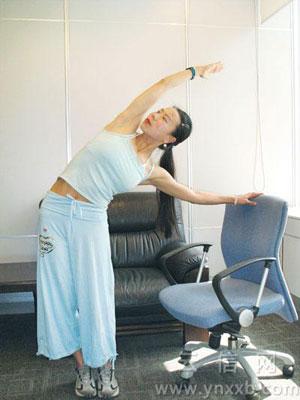 動(dòng)作要領(lǐng):挺身直立,雙腳并攏,左手放在椅背上,右手高舉過(guò)頭頂,貼緊耳側(cè)。吸氣脊柱向上延伸,呼氣上身從腰部彎曲,傾向左側(cè),彎曲到最大限度,想象自己是一棵隨風(fēng)搖擺的樹。保持10-20秒鐘,換方向重復(fù)動(dòng)作。