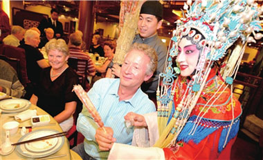 昨晚7點(diǎn),在前門全聚德烤鴨店,京劇、川劇變臉和老北京的糖葫蘆,讓來自美國的130余名游客感受了一把地道的中國風(fēng)。而這也是今年以來,該店接待人數(shù)最多的一個(gè)外國旅游團(tuán)隊(duì)。(記者范繼文 胡笑紅攝影報(bào)道)