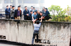 時間一分一秒過去,周周哭喊了將近兩小時!拔也惶鴺橇!9時許,被兒子哭聲警醒的嚴(yán)某,突然號啕大哭,雙腳從樓頂邊緣縮了回來后,向民警靠近。兩民警趁機(jī)上前,將其抓獲。
