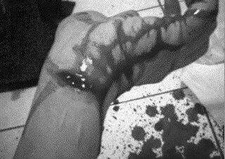 記者看到,帖子中還貼上了兩張割腕時(shí)血腥的照片,女孩被割破的左手有一道明顯的口子,依然還冒著血,而地板上一攤紅紅的鮮血看了讓人覺得不寒而栗。