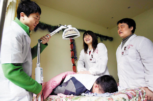 去年12月,劉瑞和周陽回到重慶,開始四處尋找合適的鋪面,“我們遇到很多好心人,知道我們是大學(xué)生,都是盲人,很多人主動站出來幫我們。”指著40多平方米的小診所,劉瑞說,房東王艷在從朋友口中知道了三人的遭遇后,主動把自己的房子低價租給他們,并免去前三個月的房租,鼓勵三人創(chuàng)業(yè)。