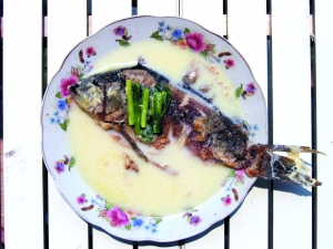 3. 洗凈宰好的鯽魚(yú),刮去腹內(nèi)黑膜,摳掉鯽魚(yú)的咽喉齒(位于鰓后咽喉部的牙齒,泥腥味很重),瀝干水分;