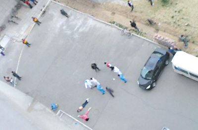 昨天,該校一名現(xiàn)場目擊者陳姓學生透露,先聽到有一男一女的爭吵聲,接著聽到一個女生的嘶喊聲,后來就看到一女一男先后從公寓樓墜下。當天下午6:40左右,北京朝陽警方迅速封鎖現(xiàn)場,展開調(diào)查。另一目擊者說,當晚6:20,一名女生從靜思苑13層東南側(cè)樓梯窗口墜下,5分鐘后男生從同一位置墜下。墜樓后,兩人橫躺在宿舍樓南側(cè)的地面上,女生穿粉紅色睡衣,男生光著上身,下身穿牛仔褲,身下有大片血跡。原來,兩人墜樓的窗臺高約1米,窗戶面積不足1平方米,窗戶的紗窗已被撕開,一件藍色運動上衣還留在窗臺上,附近地面上還有數(shù)根煙頭,該樓一層東側(cè)入口處的欄桿也被砸斷!