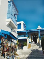 站在小鎮(zhèn)的最高處,才會(huì)發(fā)現(xiàn)其實(shí)這里地勢險(xiǎn)要,真是臨海的峭壁?烧且?yàn)榍逡簧乃{(lán)色和白色,消解了所有的陡峭,將一切平和地鋪展開來。聽說這里的房屋之所以選擇白色,主要是出于生活上的考慮,因?yàn)榈刂泻Q匕兜南奶鞖夂蜓谉幔咨哂胁晃鼰嵊秩菀咨岬奶匦,因此涂在房屋外墻,可保持室?nèi)涼爽,再加上這里盛產(chǎn)石灰,于是選擇白色也就理所當(dāng)然了。一位突尼斯朋友開玩笑說,在這里只消賣藍(lán)色油漆和白色石灰,就能讓生活過得自由自在。事實(shí)上,如此讓人驚艷的藍(lán)與白的搭配,在地中海沿岸的其他地方并不鮮見,只是突尼斯人對(duì)生活的熱愛,對(duì)人的天性的格外尊崇,才使得西迪布賽這座“藍(lán)白小鎮(zhèn)”成為世上一個(gè)獨(dú)特的存在。