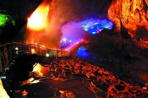 地下河景區(qū)里的云南梯田、微縮長城、洞中黃果樹等景點(diǎn)令人嘆為觀止。撐船在溶洞暗河里穿行,遠(yuǎn)遠(yuǎn)地就聽見轟隆隆的水流聲,舉目四望,卻見不到一丁點(diǎn)水花,拐了幾個彎之后,一簾瀑布傾瀉而下,帶來意外的驚喜。大自然以其鬼斧神工把中國自然山水與人文建筑的精華濃縮得惟妙惟肖,然后又以乾坤大挪移的手法把它們都囊括到這個溶洞之中,其中究竟,怎一個“奇”字了得?