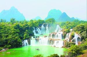 大新縣也是中越邊境縣,這里最著名的,就是中越跨國瀑布——德天瀑布。德天瀑布位于中越邊境的歸春河上游,距中越邊境53號碑約50米。清澈的歸春河是左江的支流,也是中越邊境的國界河,德天瀑布則是它流經(jīng)浦湯島時的杰作,江水從高達(dá)50余米的山崖上跌宕而下,撞在堅(jiān)石上,氣勢磅礴;主體瀑布寬100米,落差70米,與越南的板約瀑布連為一體,瀑布總寬208米,是東南亞最大的天然跨國瀑布,也是世界第二大跨國瀑布。中越邊民在瀑布的下游,進(jìn)行著邊貿(mào)往來,以前是肩挑人扛,現(xiàn)在已用車船運(yùn)載了。