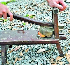 “中國(guó)古代早就有辦法做鮮榨果汁了!”林伯手中的“榨汁器”像是一把勺子倒扣在一條小板凳上,將水果放在勺子下,用力擠壓,果汁便會(huì)順著木板上的凹槽向下流出。