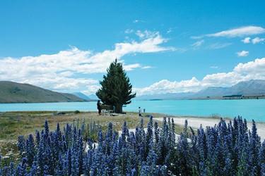 擱下行李我們一直向南而去,尋找皇后鎮(zhèn)南端的人間仙景蒂卡波湖。寂靜的湖面,四周覆蓋著蒼翠的樹木和盛開的魯冰花,加上對(duì)岸雪山倒影,四季美景濃縮一簾。缺水的新西蘭島國(guó)對(duì)湖水的利用可以說是費(fèi)煞苦心,海拔700多米的高山湖泊,筑了7條人工導(dǎo)流明渠,不但用以截流灌溉,而且,還在每一出水口修建了水利發(fā)電廠,7座電廠為南島的畜牧農(nóng)漁提供了豐裕的清潔能源?蒲腥藛T還在截流湖中試養(yǎng)原本生活在大海里的“三文魚”。第一次見到在淡水中游弋的“三文魚”,怎不叫人嘴饞!花上10個(gè)紐幣,我們吃上了活殺生食的淡水“三文魚”。說實(shí)話,這人工飼養(yǎng)的淡水“三文魚”太肥太油膩,口感和味道遠(yuǎn)差海水“三文魚”一籌,但我還是由衷感到高興,這畢竟是人類由漁到養(yǎng)的轉(zhuǎn)變,“三文魚”將永不枯竭。食罷魚宴,不久,我們的車已駛?cè)肓诵挛魈m著名的南島水果園,紅的櫻桃、粉的水蜜桃、黃的杏子、綠的蛇果,五顏六色的累累碩果,掛得樹條彎下了腰。為了充分利用水資源,每棵樹下均有一條微型水管進(jìn)行滴灌,晝夜較大的溫差,明媚陽光的輻射和沒有污染的潔凈空氣,給水果提供了優(yōu)良的生長(zhǎng)環(huán)境,來到了果園,人人現(xiàn)摘現(xiàn)吃。導(dǎo)游見我從樹上摘下櫻桃還要在自己T恤上蹭蹭,便告訴我說,不用蹭,這里的水果很干凈。于是,我扔幾粒入口,原汁原味。