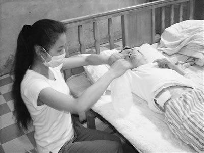 張錦現(xiàn)在每天都會(huì)為母親做三次“水透”。為了讓置放在母親體內(nèi)的輸液管不被細(xì)菌感染,她就將家里的窗戶(hù)緊閉,以防灰塵進(jìn)入。