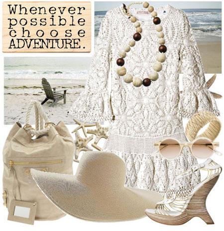 鉤編刺繡蕾絲華美連衣裙,適合海邊的優(yōu)雅高貴裝扮,必備的飾品一定是寬檐草帽,墨鏡和高跟鞋。