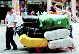 一德路。爸爸前面拉,媽媽后面推,孩子坐在車上吃午飯。
