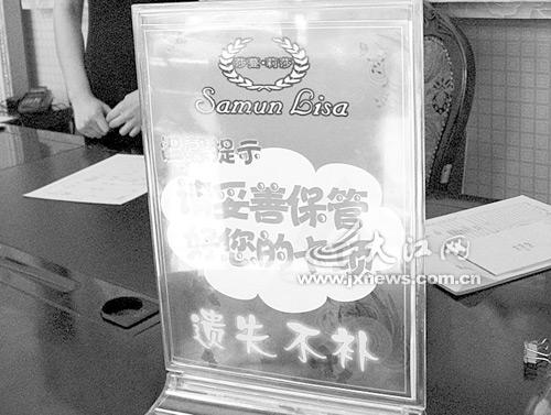 5月31日,記者陪同蔣女士來到莎蔓莉莎美容院。記者注意到,莎蔓莉莎美容院前臺擺放的提示牌十分醒目,上面注明“請妥善保管好您的卡項,遺失不補,最終解釋權(quán)歸莎蔓莉莎美容院”。