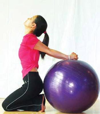 3.雙手交叉相握,使雙臂在身后抬起,并盡量舉向頭頂,令上身向地面俯壓下去,使胸部碰觸到膝蓋。