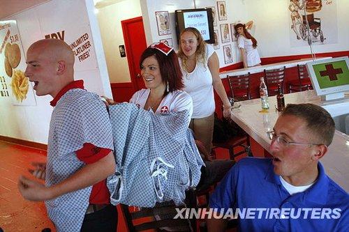 6月17日,在美國(guó)亞利桑那州錢(qián)德勒的“心臟病燒烤”餐廳,女服務(wù)員在食客就餐前為其穿上病人服。新華社/路透