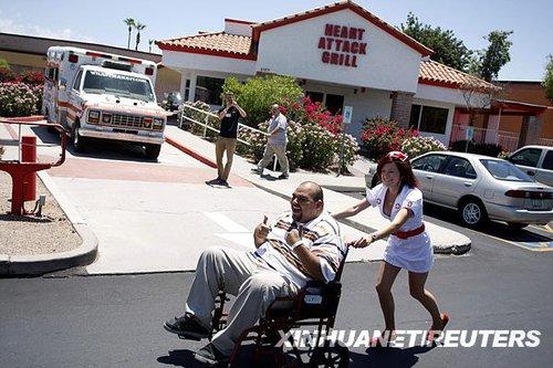 6月17日,在美國(guó)亞利桑那州錢德勒的“心臟病燒烤”餐廳,女服務(wù)員用輪椅推著用餐后的食客離開。新華社/路透