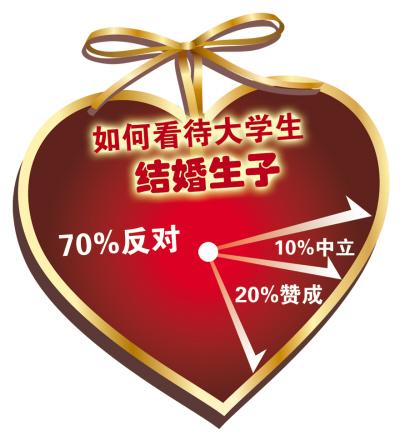 在校大學(xué)生結(jié)婚生子,社會是怎么看待的呢?記者昨日通過網(wǎng)絡(luò)隨機采訪了30位網(wǎng)友,他們中有公務(wù)員、醫(yī)生、教師、大學(xué)生、白領(lǐng)、工人、家庭主婦等各類人群。結(jié)果顯示,約7成人反對,2成人贊成,還有1成人持中立態(tài)度。