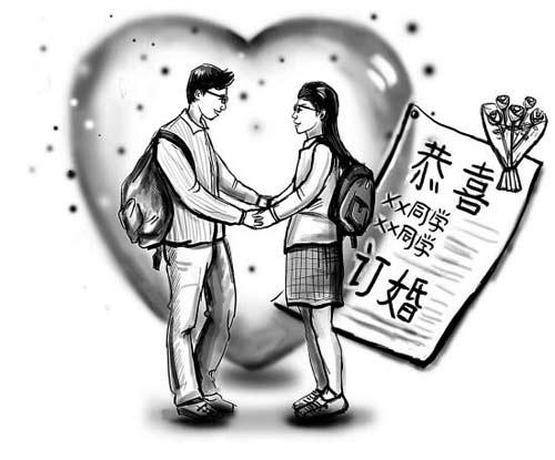 可當事人的特殊身份,卻讓記者幾度懷疑這是虛假消息——訂婚的正是小記者的同學,杭州某中學高三兩位剛剛參加完高考的學生,F(xiàn)在大學生結(jié)婚也少有人能接受,乍聽說這則中學校園里傳出的雷人婚訊,記者半晌沒回過神來。