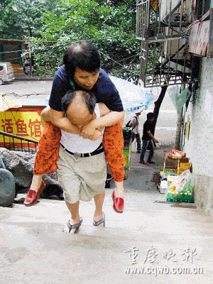 沒有其他生活來源,樓下臨街的煙攤是夫妻倆唯一的生活希望,兩人24小時輪流守候。妻子因病無法行走,殘疾丈夫每天要背她上下樓梯58步。11年來,沙坪壩區(qū)的周靈夫婦風(fēng)雨無阻地走過了9萬步樓梯。