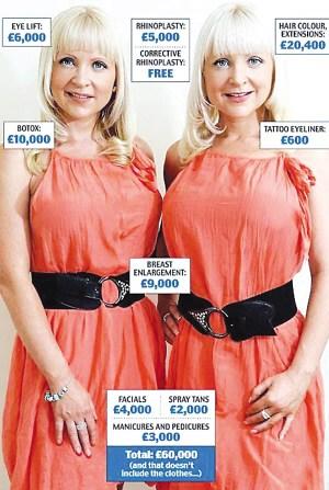 21歲那年,喬決定去做隆鼻手術(shù)。凱莉自然也不甘落后,于是照樣學(xué)樣。凱莉表示:“我們痛恨任何長(zhǎng)相上的差異,所以我們不得不一同去做整容手術(shù)!26歲那年,為了“熨平“額頭上的第一道皺紋,姐妹倆雙雙開始定期注射肉毒素。2004年姐妹倆29歲那年,雙雙找到同一位整形醫(yī)生,各花4500英鎊接受了隆胸手術(shù)。有趣的是,由于姐妹倆長(zhǎng)得形如“克隆人”,主刀醫(yī)生為了防止“串戶”,手術(shù)前不得不在她們各自的腹部上記上名字。這對(duì)孿生姐妹花迄今已經(jīng)共同接受了不下6次美容手術(shù),總耗資超過6萬英鎊。姐妹倆表示,她們無論做什么手術(shù),都將指定同一位醫(yī)生,以便讓她們永遠(yuǎn)“難以分辨”。(宗 文)
