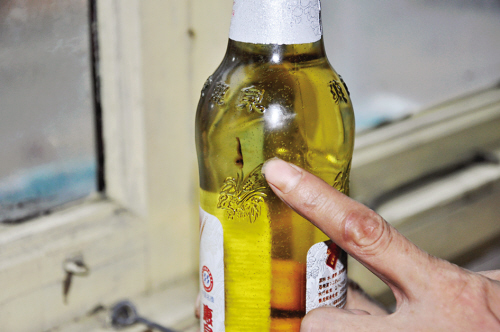 黃先生的餐館開(kāi)在福清漁溪鎮(zhèn),昨日,在餐館里記者看到這瓶啤酒,其瓶蓋仍完好無(wú)損,上面標(biāo)注著生產(chǎn)日期為“2009年7月16日”,尚在保質(zhì)期內(nèi),生產(chǎn)商是福建燕京惠泉啤酒股份有限公司,啤酒瓶?jī)?nèi)漂浮著兩個(gè)指甲大小的“蝌蚪”狀黑色物質(zhì)。一名顧客說(shuō):“真惡心!”
