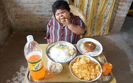 這個(gè)女孩名叫蘇曼·卡圖恩,住在印度西孟加拉邦。她一周要吃掉10公斤大米、24個(gè)雞蛋,6升牛奶和5公斤土豆。饑餓常常驅(qū)使她溜到鄰居家找食物。