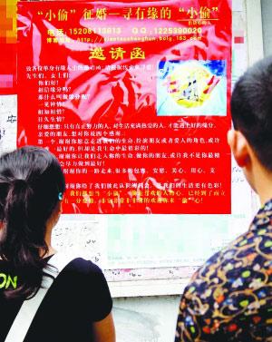 這張大紅海報(bào)十分喜慶,上貼一張七夕圓月牛郎織女相會(huì)圖,留下征婚者的電話號(hào)碼、QQ號(hào)碼及網(wǎng)絡(luò)博客地址,另有一些真情話語(yǔ)。乍一看,這“小偷”征婚還真蒙混人,可走近一瞧,才發(fā)現(xiàn)標(biāo)題上的“小偷”下面有五個(gè)小字注釋:指偷心的人。