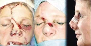 去年8月的一個深夜,她被一陣劇烈的咆哮聲吵醒,只見“奧利”正從床上跳下地面。普林塞斯回憶道:“我感覺一滴鮮血正從臉上滴下。由于疼痛難忍,我急忙下床沖進(jìn)衛(wèi)生間照鏡子。我打開燈,簡直不敢辨認(rèn)鏡中的那個人—— 一切就像恐怖片中的鏡頭!”原來,在普林塞斯的面部中央,鼻子不翼而飛,只留下兩個如同金魚眼睛般大小的洞穴。出奇冷靜的她一邊高聲喊醒大兒子卡奇呼叫救護(hù)車,一邊用一條沾了水的毛巾將面部緊緊裹住。