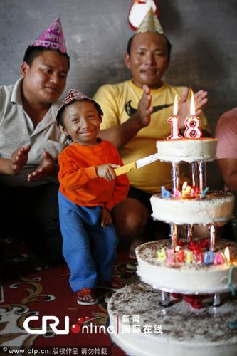 2009年10月10日,尼泊爾波卡拉,卡根德拉·塔巴·馬加爾(Khagendra Thapa Magar)在一個和自己身高差不多的蛋糕前慶祝生日。據(jù)悉,他的生日愿望是找一個和自己一樣袖珍的老婆。10月14日他將年滿18周歲,屆時身高只有51厘米的他將可以正式被吉尼斯世界紀錄確認為世界上最矮的人