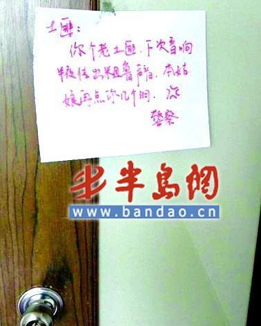 我是特別喜歡玩CS,玩了近5年,咋也不膩,腰不酸,腿也不疼,腦袋還特別好使。國慶前不久,早上起床收到鄰居“純爺們”貼在俺門上的一張紙條,看到“純爺們”發(fā)飆,趕緊拍下來留做紀(jì)念。人家在上面寫著:“你個(gè)老土匪,下次音響弄出粗暴聲音,本姑娘再給你在身上點(diǎn)幾個(gè)洞!”