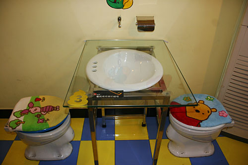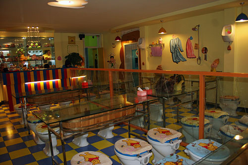小小的門面,狹窄的樓梯。走上二樓后,這個(gè)布置得充滿了童趣的餐廳才展現(xiàn)在食客面前。這里的每把座椅都是一座標(biāo)準(zhǔn)的沖水馬桶。盛放主餐的不是盤子,而是微型馬桶,冷飲則大都放在“蹲坑”形狀的便器里。好在這些餐具造型卡通,并不會(huì)讓人大倒胃口。