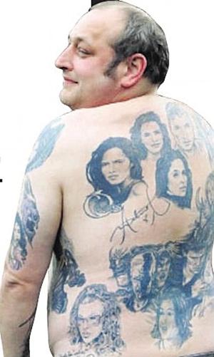 據(jù)英國媒體9日報道,英國41歲男子斯蒂夫·波特(右圖)堪稱是一名“超級追星族”,在過去10來年中,他將自己最喜愛的24名歐美影星和搖滾歌星的頭像都文在了自己的前胸、后背、臂膀以及大腿上。其中的12個明星還在波特的身體皮膚上留下了各自的親筆簽名。每當(dāng)一個明星用筆在波特的皮膚上簽名后,波特就會立即趕往一個文身藝術(shù)家的工作室中,請文身藝術(shù)家將他最新得到的名人簽名也永久性地文在他的皮膚上。據(jù)悉,波特目前計劃申請吉尼斯世界紀(jì)錄。