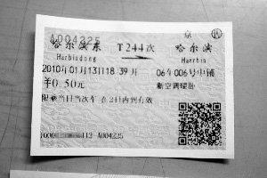 倪先生說,日前,他在論壇看到有人說能買到這么便宜的火車票,覺得很好奇,就去了家門口的一家火車售票點,買到了5毛錢的硬臥火車票,外加5塊錢手續(xù)費,“那個賣票的小伙子都震驚了,他都不知道有這么便宜的票。”倪先生,這兩站之間有八九公里,坐公交車按照當?shù)貎r格得一塊錢吧!庇浾呖吹剑@是一張1月13日哈爾濱東開往哈爾濱的T244次新空調(diào)硬臥中鋪票,價格處印著“0.5元”。倪先生說,他買這張票只為收藏,不會真的去乘坐。