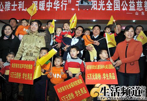 雅士利集團(tuán)山東營(yíng)業(yè)部經(jīng)理馬紅兵表示:雅士利一直以來(lái),將公益活動(dòng)當(dāng)作自己的使命,當(dāng)作一項(xiàng)偉大的事業(yè),盡心盡力地做好它。希冀以此來(lái)回報(bào)社會(huì)多年來(lái)對(duì)雅士利品牌的信任和厚愛!雅士利人從扶貧救災(zāi),到修橋造路;從文化體育,到醫(yī)療衛(wèi)生的公益道路上永不停步,多形式向社會(huì)捐款捐資超4000萬(wàn)元。雅士利將通過這項(xiàng)千萬(wàn)陽(yáng)光工程,并和山東省慈善總會(huì)合作,捐贈(zèng)價(jià)值50萬(wàn)元的奶粉一批,對(duì)邊遠(yuǎn)地區(qū)弱勢(shì)群體,對(duì)兒童的健康和教育給予特別關(guān)愛,希望繼續(xù)將“愛心”與“溫暖”灑向齊魯大地。