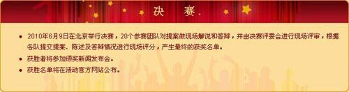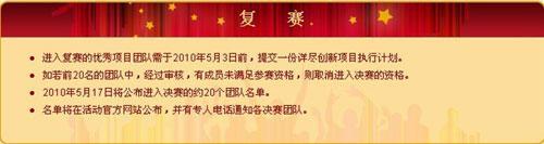 參賽項(xiàng)目團(tuán)隊(duì)需于2010年3月28日之前提交一份標(biāo)準(zhǔn)化的報名表,其中包括團(tuán)隊(duì)成員基本信息和創(chuàng)新項(xiàng)目提案:項(xiàng)目優(yōu)勢、創(chuàng)新核心、環(huán)境和可行性分析、執(zhí)行方案和預(yù)期目標(biāo)。
