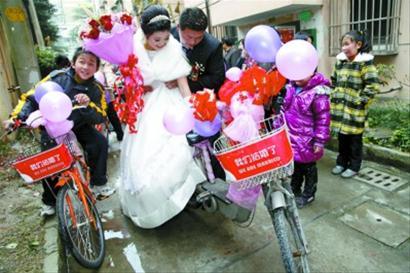 “四輪車人人結婚都會乘,兩個輪子的就少見了吧。 ”新郎孫軍說,現在政府提倡節(jié)能以保護環(huán)境,用租賃自行車迎親,既響應了政府號召,又降低了婚禮成本。并且這種形式與眾不同,非常有紀念意義。新郎新娘都姓孫,在同一家房地產公司工作,在商量婚事時,新娘希望能用一種別樣的方式來紀念他們的特殊緣分,于是這個自行車迎親方案立即得到了大家的青睞,“很特別,能讓人記一輩子”,新娘笑著說。